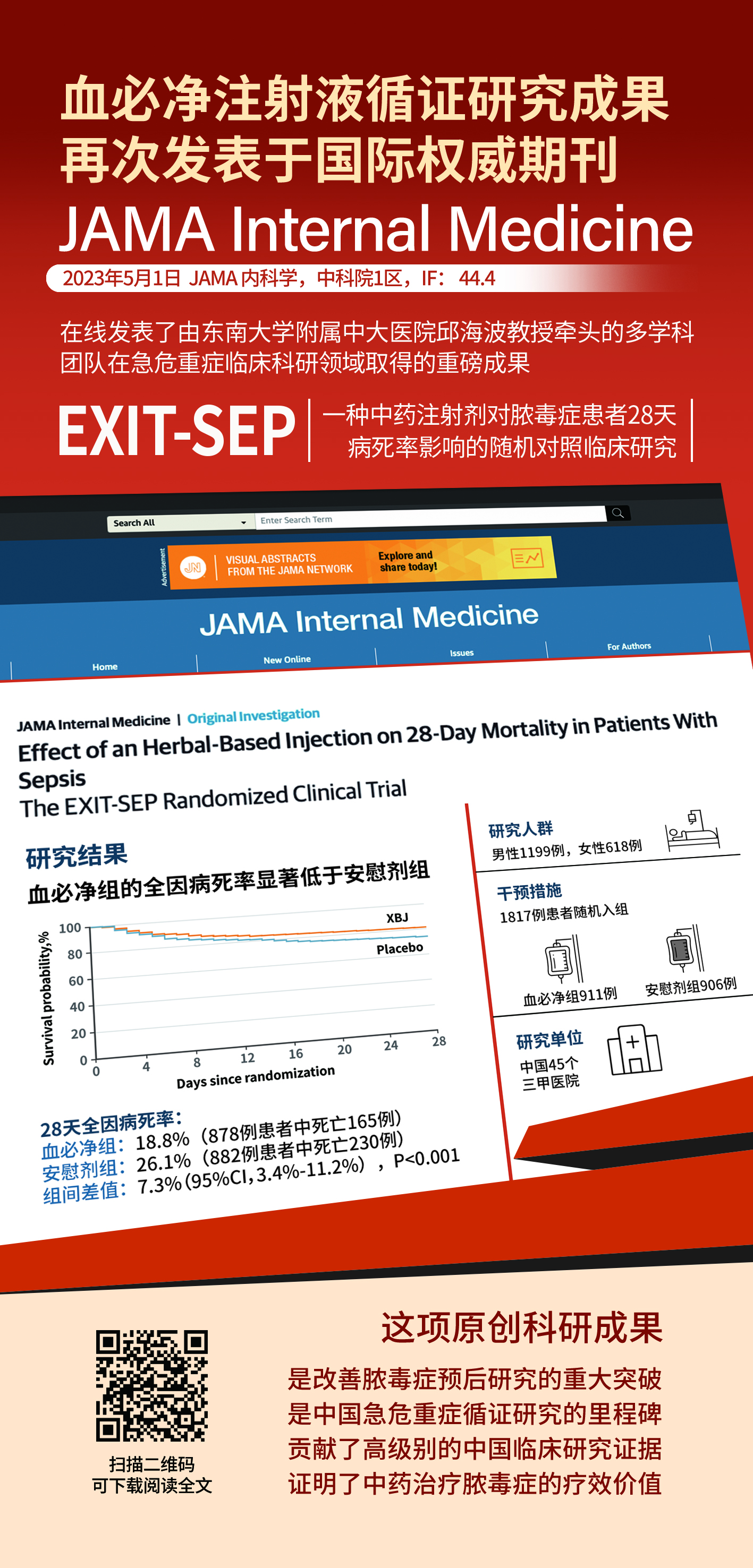 2023Äê5Ô£¬¡¶JAMA Internal Medicine¡·£¨JAMA.ÄÚ¿ÆÑ§£¬2021ÄêÓ°ÏìÒò×Ó£º44.4£©È«ÎÄÔÚÏß½ÒÏþÁËÒ»ÖÖÖÐÒ©×¢Éä¼Á¶Ôŧ¶¾Ö¢28Ì첡ËÀÂÊÓ°ÏìµÄRCTÑо¿ÂÛÎÄ¡£¸ÃÑо¿Óɶ«ÄÏ´óѧÁ¥ÊôÖдóÒ½ÔºÖØÖ¢Ò½Ñ§¿ÆÇñº£²¨½ÌÊÚǣͷ£¬ÌìÏÂ45¼ÒÈý¼×¼¶Ò½ÔºÖØÖ¢¡¢¼±Õï¡¢ºôÎü¶àѧ¿ÆÍŽáÍê³É¡£Í¨¹ý¶Ô1817Àýŧ¶¾Ö¢»¼ÕßµÄÊý¾ÝÆÊÎö£¬Ö¤ÊµÍ¨ÀýÖÎÁÆÍŽáѪ±Ø¾»×¢ÉäÒºÖÎÁÆ£¬¿ÉÏÔÖø½µµÍŧ¶¾Ö¢»¼Õß28ÌìÈ«Òò²¡ËÀÂÊ7.3%£¬»®·Ö½µµÍICU²¡ËÀÂʺÍסԺ²¡ËÀÂÊ5.8%£¬28ÌìÄÚδסICUÌìÊý¶à2.1Ì죬28ÌìÀÛ¼ÆÎ´Ê¹ÓûúÐµÍ¨ÆøÌìÊý¶à1.8Ìì¡£ÕâÏîÔ´´¿ÆÑÐЧ¹û£¬ÊǸÄɯŧ¶¾Ö¢Ô¤ºóÑо¿µÄÖØ´óÍ»ÆÆ£¬ÊÇÖйú¼±Î£ÖØÖ¢ÑÖ¤Ñо¿µÄÀï³Ì±®£¬Ð¢Ë³Á˸߼¶±ðµÄÖйúÁÙ´²Ñо¿Ö¤¾Ý£¬Ö¤ÊµÎúÖÐÒ©ÖÎÁÆÅ§¶¾Ö¢µÄÁÆÐ§¼ÛÖµ¡£